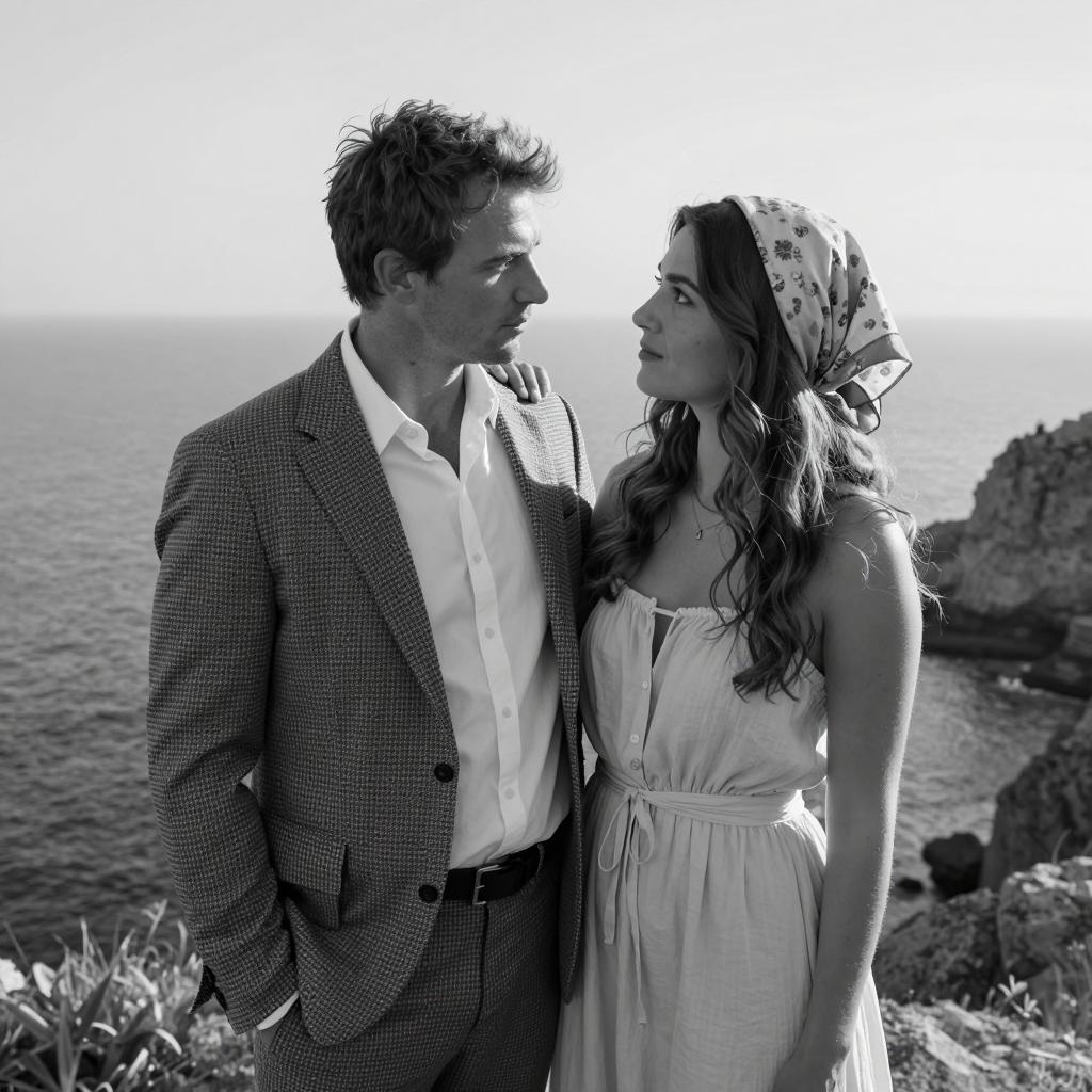 Black and white photograph of a smiling couple sitting closely together in tall grass. The woman has dark hair and wears a patterned dress with a leather jacket. The man has short light-colored hair, dressed in a white shirt with rolled-up sleeves and a dark vest. Both are engaged in a warm, intimate moment under an overcast sky.