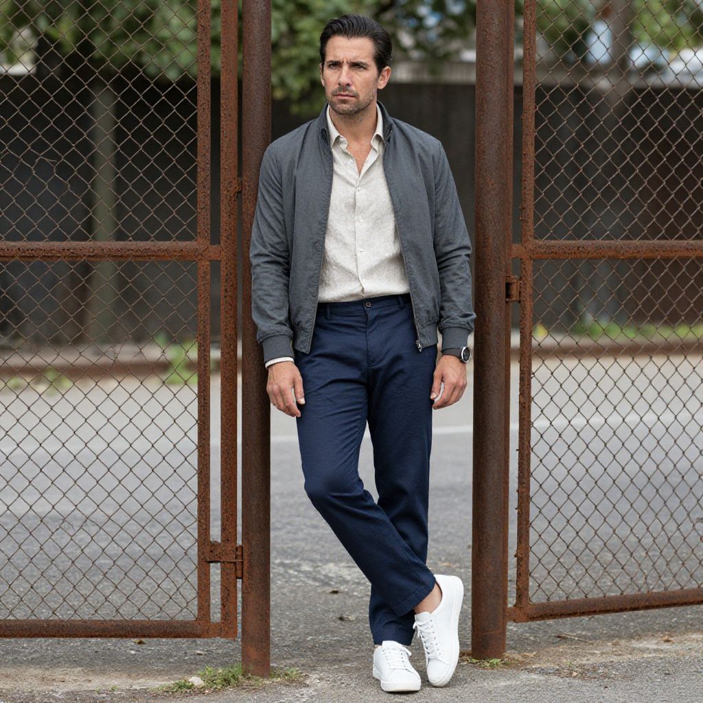 A man, lightweight beige linen shirt, tailored navy chinos, white leather sneakers, slim-fit charcoal bomber jacket, minimalist watch, standing by rusty chain-link fences, Holga camera style, contemplative expression. Man has masculine face and piercing eyes