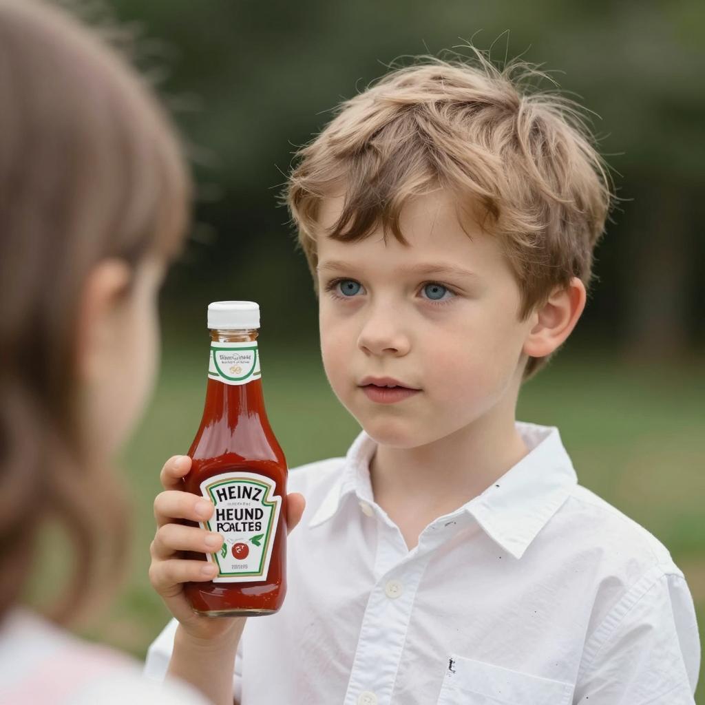 Young boy with light brown hair and blue eyes holds small bottle of Heinz ketchup in right hand, looking slightly to the left. Wearing white shirt with black pattern. Out-of-focus person with brown hair on left. Background is blurred greenery. Boy's expression is curious.