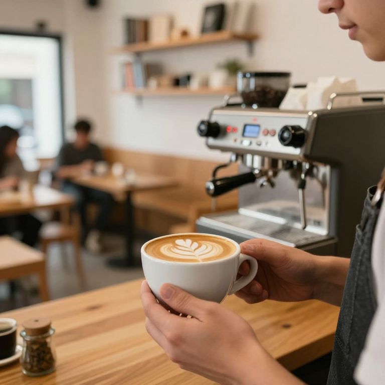 Cafetería scene featuring latte art close-up, barista's hands holding cup carefully, espresso machine in the background, warm tones, cozy yet modern interiors with bookshelves and comfortable seating, inviting atmosphere for creative work or meetings