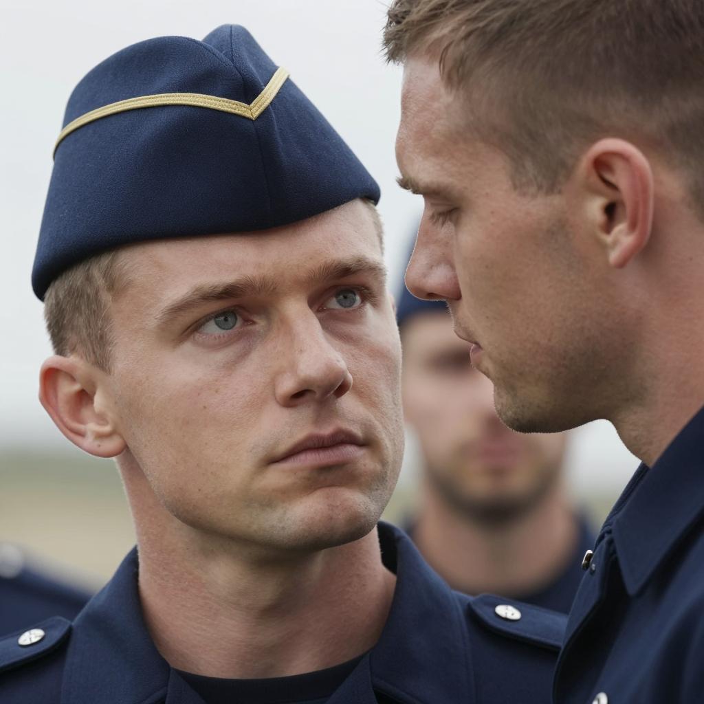 Close-up of two light-skinned men in dark blue military-style uniforms interacting closely outdoors. One man wears a blue military cap with a gold trim and has blue eyes and a serious expression. The second man, with short brown hair and a clean-shaven face, leans in with a focused expression. A third man with a beard appears blurred in the background, emphasizing the intense moment.