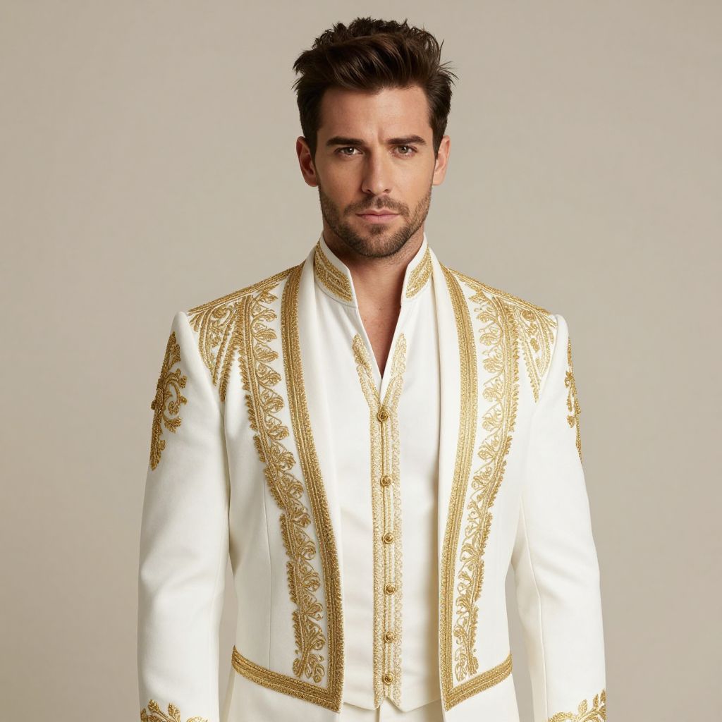 Photograph of a handsome man with dark hair and stubble, wearing an ornate white and gold embroidered traditional jacket, against a plain gray background.