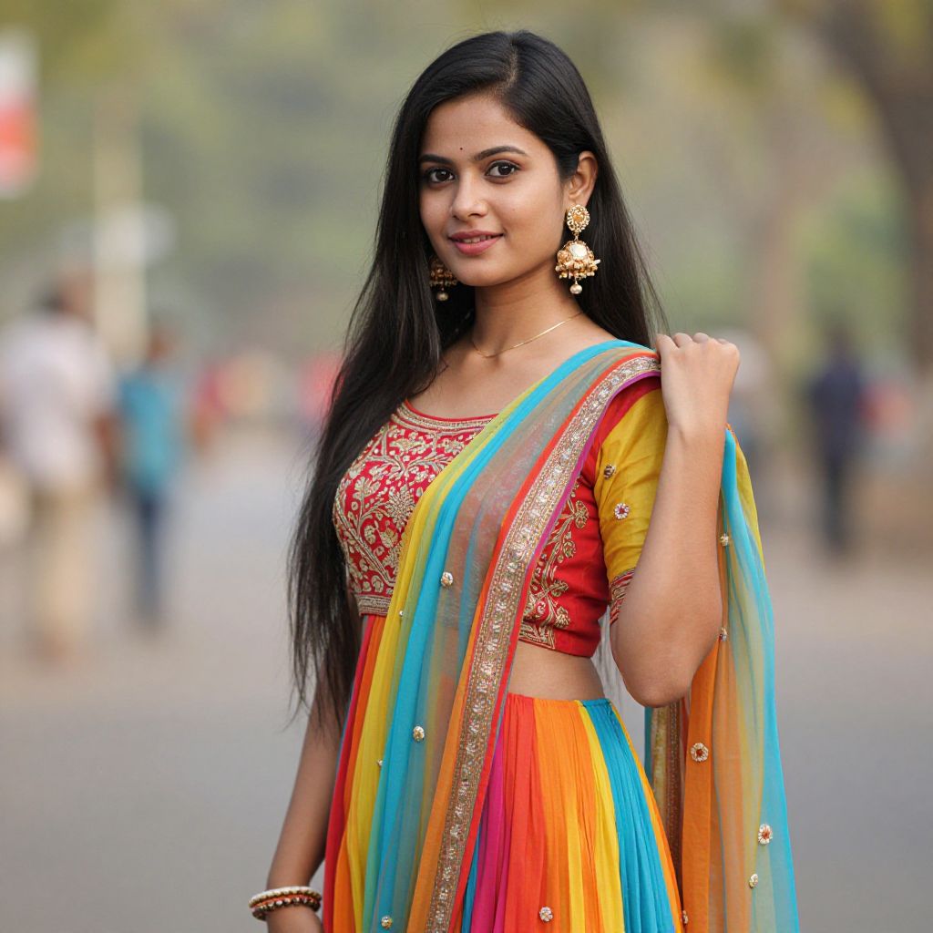 "western holi outfit, 1girl, solo, jewelry, earrings, long hair, realistic, flower, looking at viewer, blurry, blurry background, facial mark, black hair, brown eyes, outdoors, red lips, brown hair, long sleeves, dress Realistic photo of casual sexy person with pretty face"