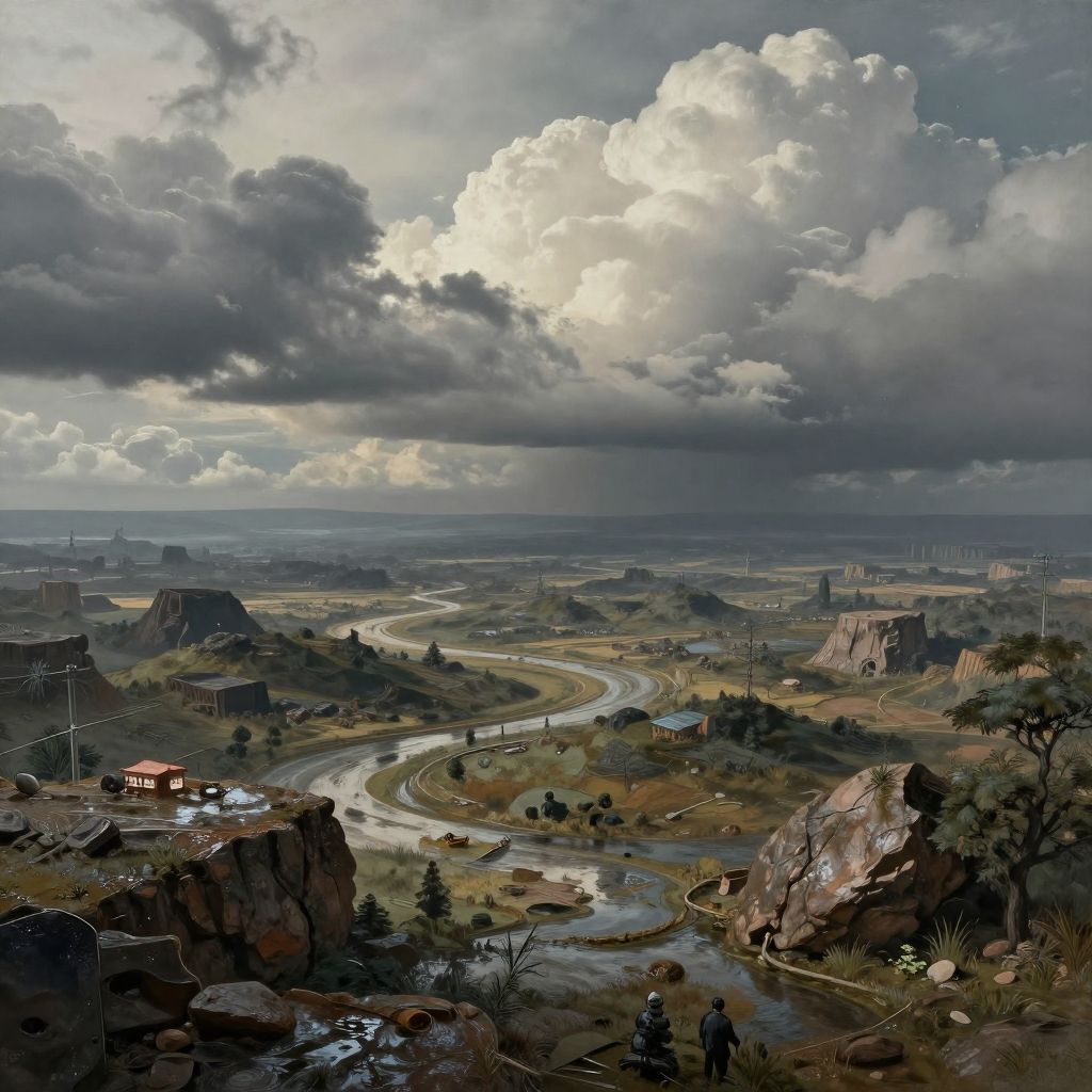 This is a digital painting of a rugged, expansive landscape under a dramatic, cloudy sky. A winding river snakes through the center, surrounded by rocky hills and sparse trees. In the lower left, a small red house sits near the river's edge. The background features distant structures and power lines. The color palette includes earthy browns and greens, with the sky showcasing dark, brooding clouds illuminated by sunlight. The texture is highly detailed, emphasizing the rough terrain and cloudy atmosphere.