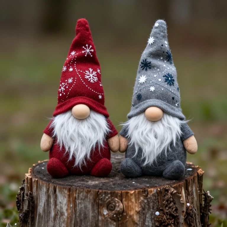 Two whimsical gnomes, cloaked in festive hues and adorned with winter's embrace, sit serenely atop a rustic wooden stump, exuding a sense of timeless charm and holiday warmth, their presence a comforting reminder of the magic and wonder that lingers in the quiet moments of the season.