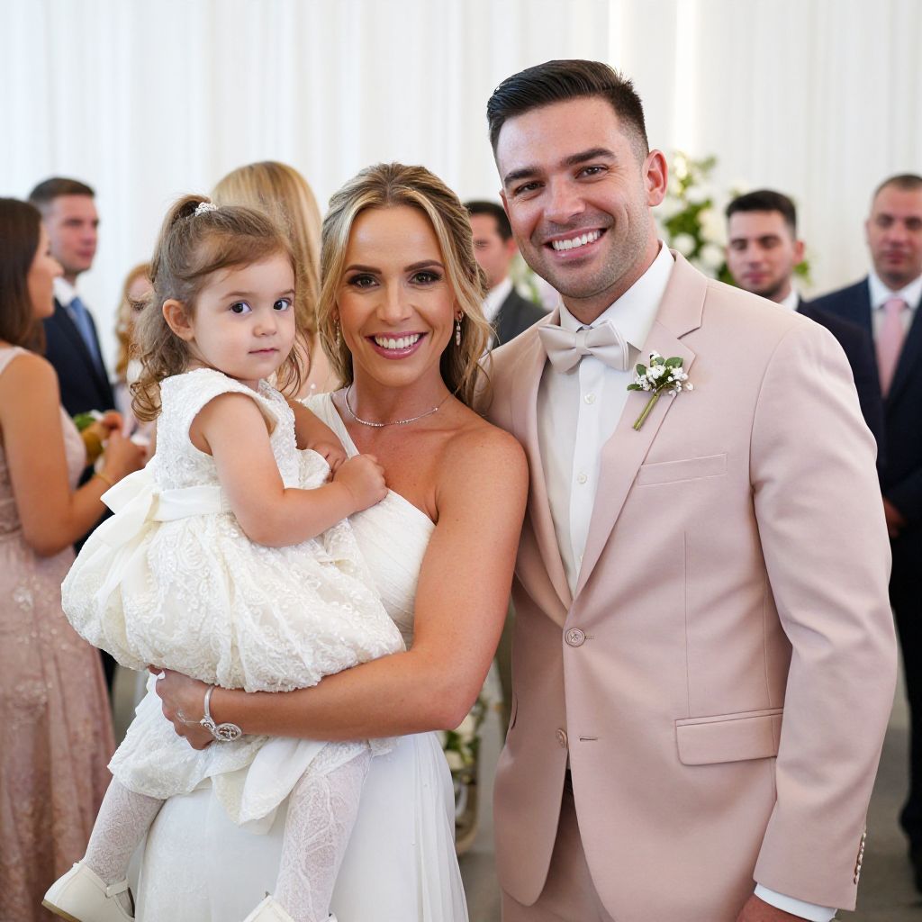 Photograph of a smiling couple and their young daughter at a wedding. The woman, with blonde hair in an updo, wears a white strapless wedding dress and holds their daughter, who has light brown hair in a ponytail and wears a white, lace-trimmed dress. The man, with short dark hair and a trimmed beard, wears a light pink suit with a white shirt and bow tie. A small white flower boutonniere adorns his left lapel. They stand closely, with the woman on the left and the man on the right. In the blurred background, several guests in formal attire are visible, including women in pink dresses and men in suits. The setting is outdoors with a bright, white sky.