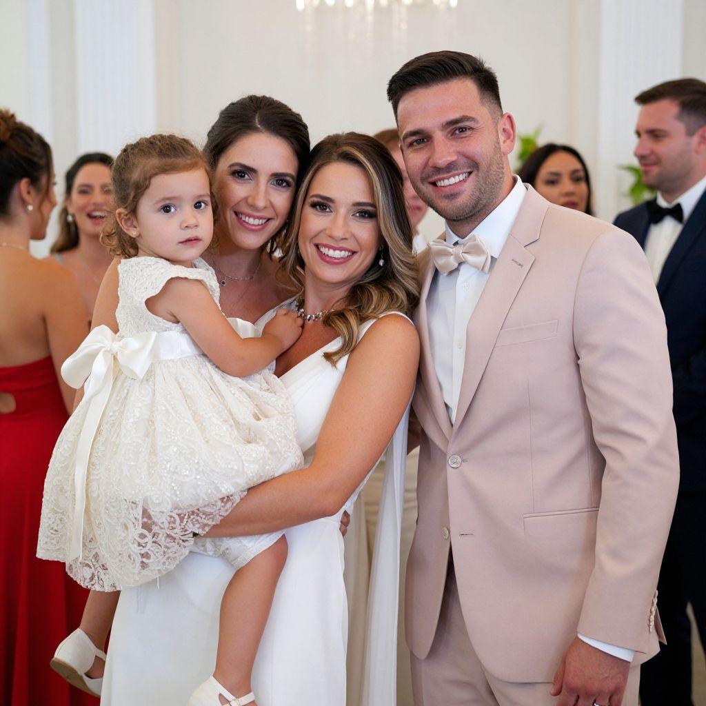 Family portrait captures a joyful moment with a woman in a white dress holding a child in a delicate white dress with sequins, flanked by a man in a light pink suit, all smiling warmly at the camera amidst a gathering of formally dressed guests in a bright indoor setting.