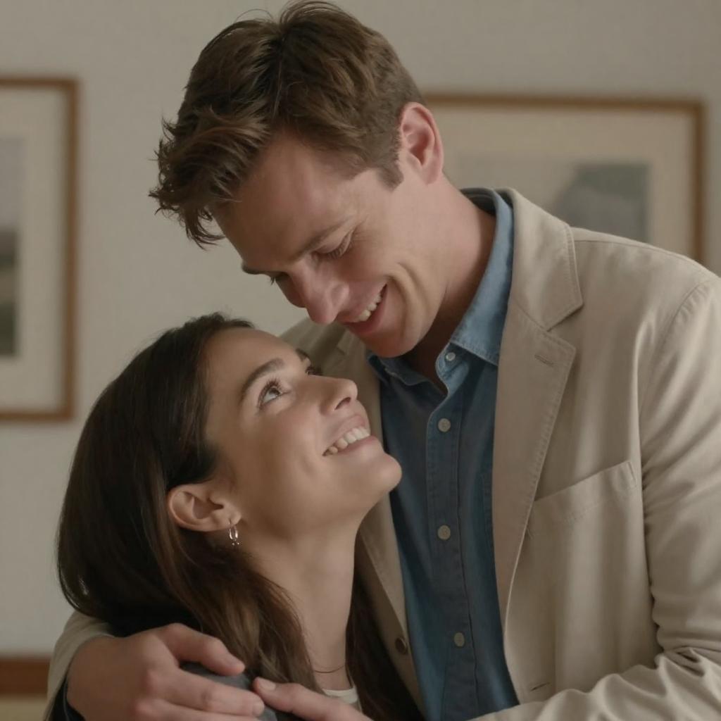 Photograph of a man and woman in an intimate moment. Man with light brown hair, blue shirt, beige jacket leans close, smiling. Woman with dark brown hair, smiling, looks up at him. Background blurred, wooden frames. Man's left arm rests on woman's shoulder. Both have intense, focused expressions. Indoor setting.