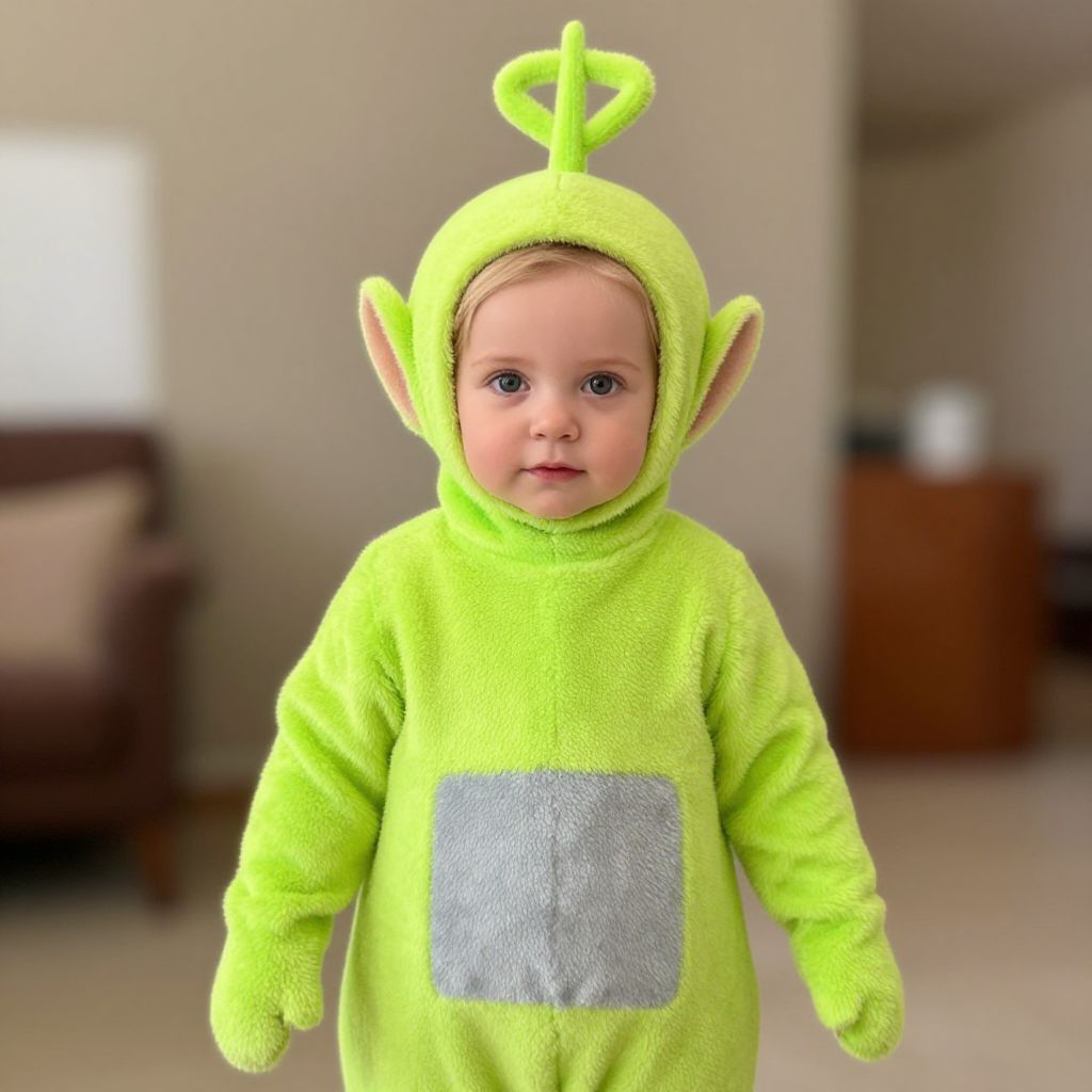 Photograph of a baby wearing a bright neon green plush alien costume with pointed ears and a gray patch on the chest, standing in a blurred living room