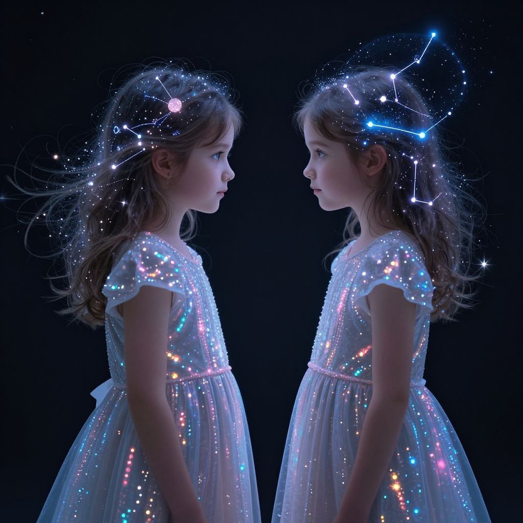 Two ethereal children adorned in shimmering dresses stand face-to-face, their hair and attire glowing with celestial constellations that seem to pulse and shift, defying the boundaries between their forms and the cosmos.