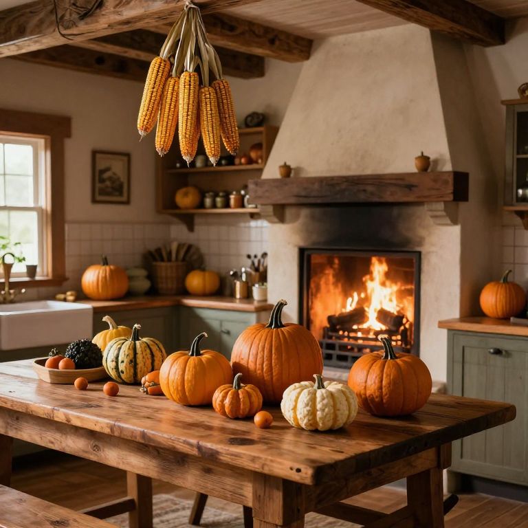 Rustic kitchen with wooden beams, hanging corn husks, roaring fireplace, and wooden table adorned with various pumpkins, autumnal decor.