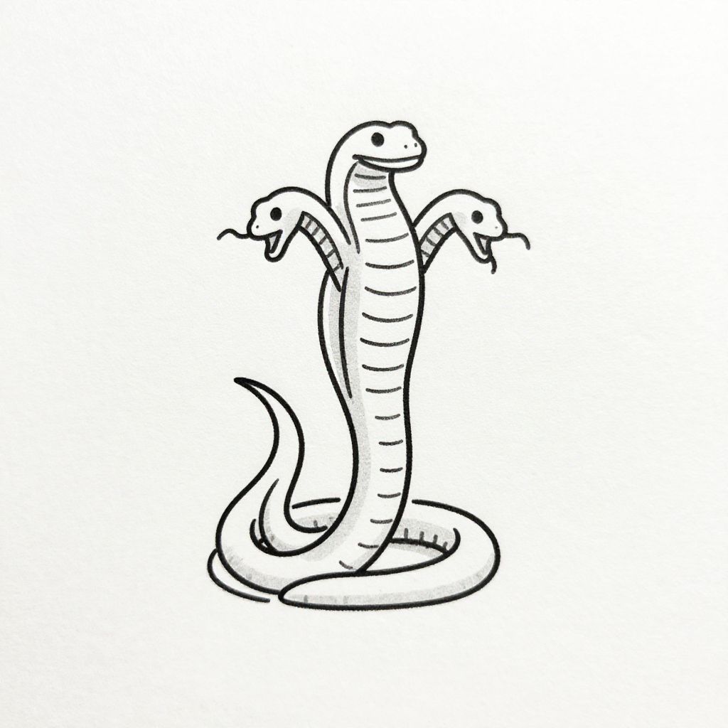 Simple hydra drawing in a minimalist style, featuring clean lines and subtle shading, showcasing the mythical multi-headed serpent poised calmly against a plain background, emphasizing clarity and elegance in black and white.