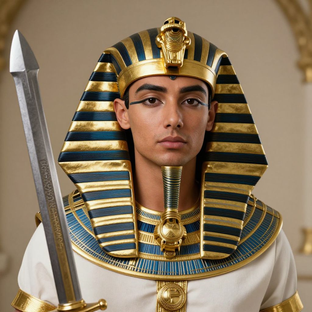 Photograph of a young man in ancient Egyptian pharaoh attire, wearing a striped black and gold nemes headdress, white robe, and holding a