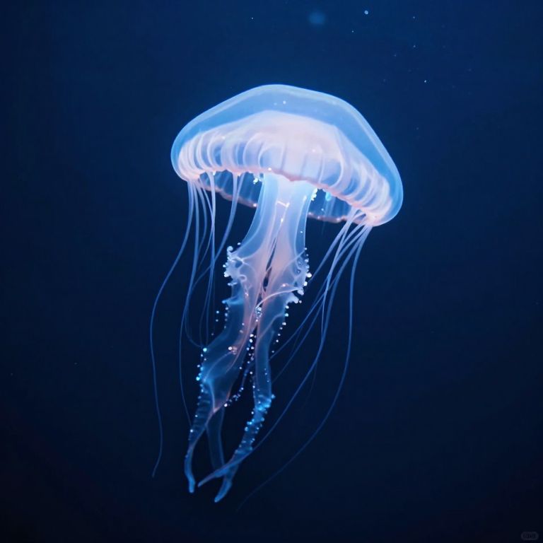 Drifting through the abyssal depths, a colossal jellyfish radiates ethereal light, weaving threads of bioluminescence that dance like whispers of forgotten dreams, embodying the paradox of solitude and infinite connection.