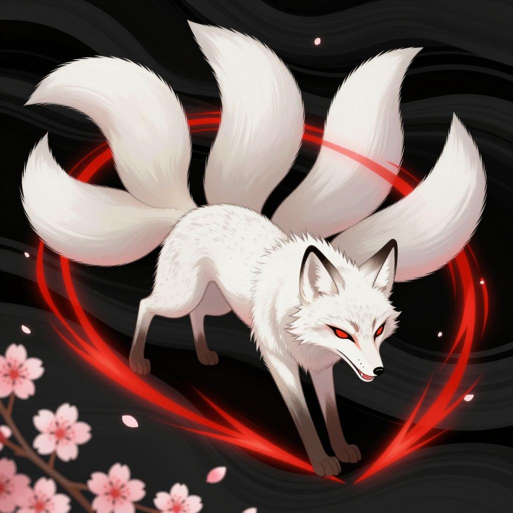 Illustration of a white fox with nine large, bushy tails, bending forward with a fierce expression. Red energy ribbons surround the fox. Pink cherry blossoms are in the foreground. Black, wavy background. Fox's eyes are closed, mouth open.