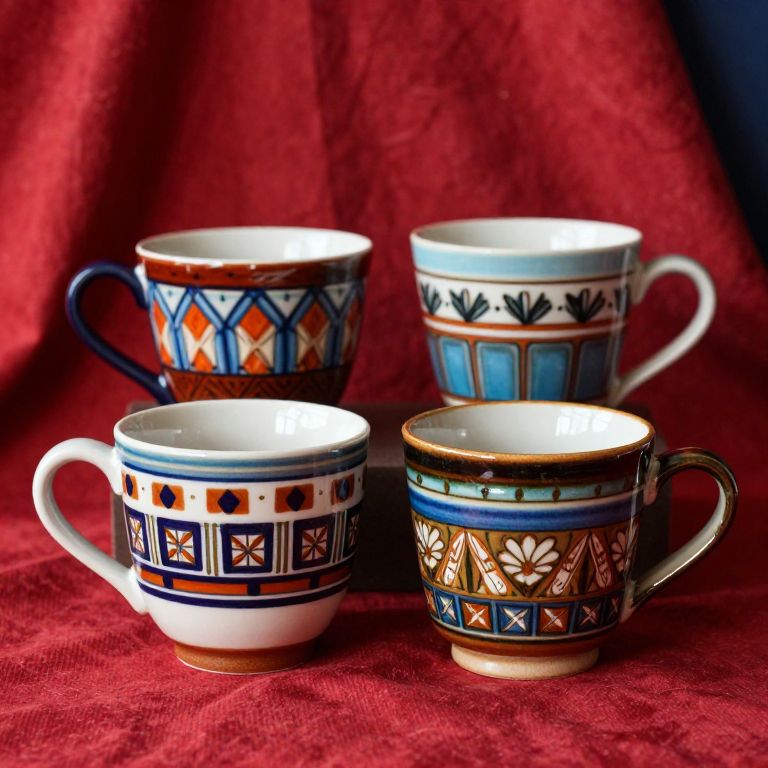 Photograph of four intricately patterned ceramic tea cups arranged on a rich red, textured fabric background. The cups feature vibrant, geometric designs with blue, orange, white, and brown colors. Each cup has a distinct handle and a glossy finish, with one cup in the back left corner showcasing a diamond pattern, the back right cup has blue panels with black leaf motifs, the front right cup features a brown and white floral design, and the front left cup displays a blue and white checkerboard pattern. The cups are evenly spaced, creating a visually appealing, balanced composition.