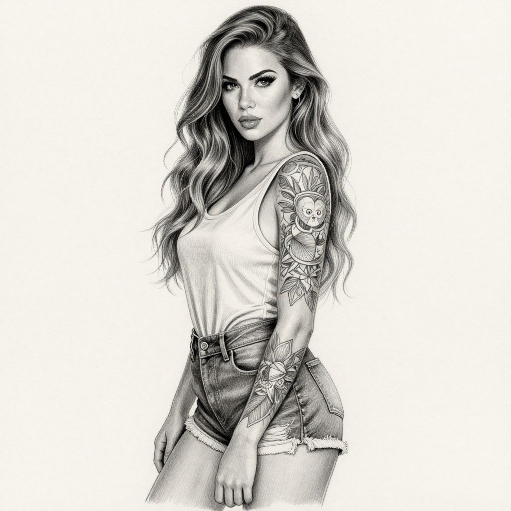 Pencil illustration depicts a confident young woman with long, wavy hair, wearing a casual white tank top and high-waisted shorts, showcasing intricate tattoos covering her right arm and shoulder, created by Melbourne-based illustrator Kelly Thompson.