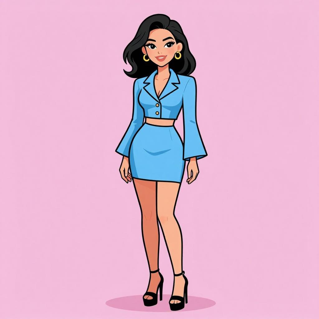 Digital illustration of a confident woman standing against a solid pink background. She has fair skin, black shoulder-length wavy hair, and wears large gold hoop earrings. Her outfit consists of a light blue, long-sleeved blazer with a buttoned front and a matching short skirt that reveals a small midriff. She also wears black high-heeled sandals. Her expression is friendly with a slight smile, and she stands with a relaxed pose, one hand by her side and the other slightly bent at the elbow. The style is cartoonish with bold, clean lines and vibrant colors.
