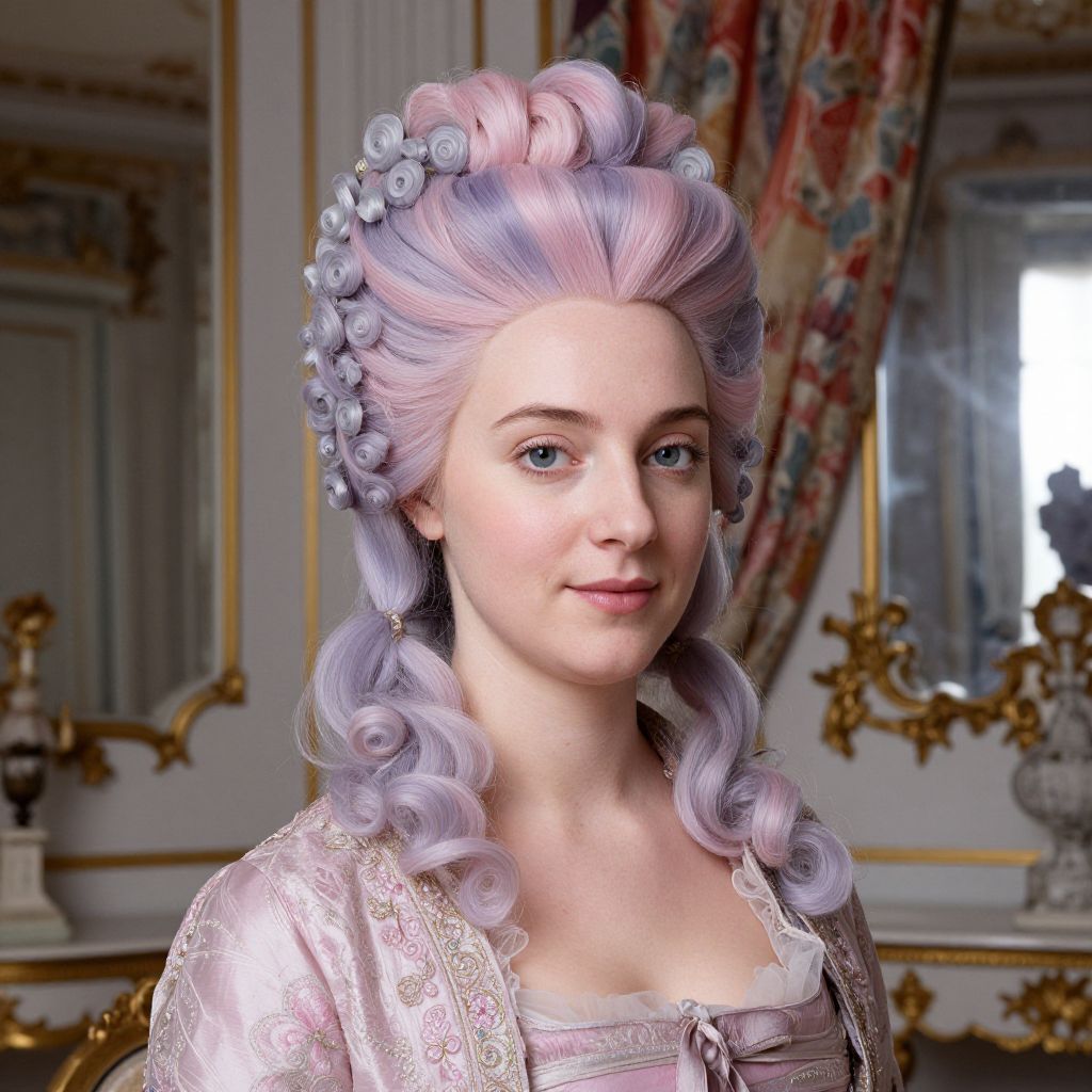A historically accurate portrait of Marie Antoinette wearing a powder wig with pastel shades of pink and lavender, her delicate face glowing with soft lighting, her elegant features showcasing high cheekbones and a refined, royal expression, set in a lavish French court interior with ornate mirrors, silk drapes, and powdered air in the background