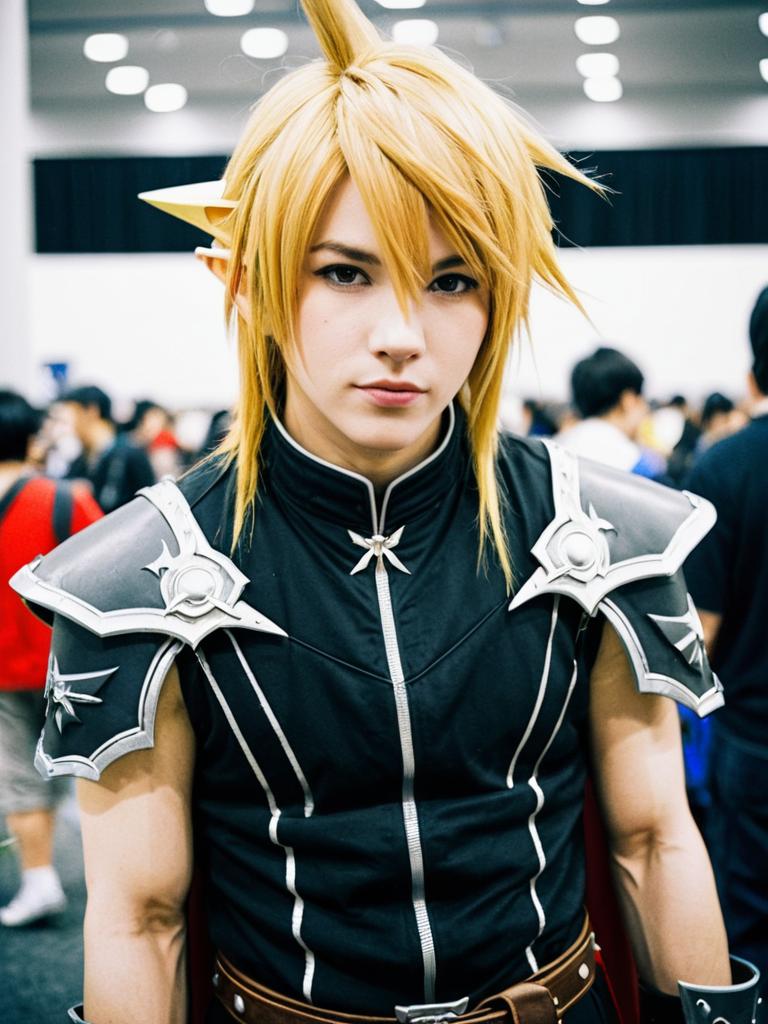 Portrait of a man cosplaying as Cloud Strife from Final Fantasy, featuring spiky blonde wig, elf ears, black pinstriped outfit with leather straps, and silver shoulder armor. The photo is taken at an anime convention with a blurred crowd background.