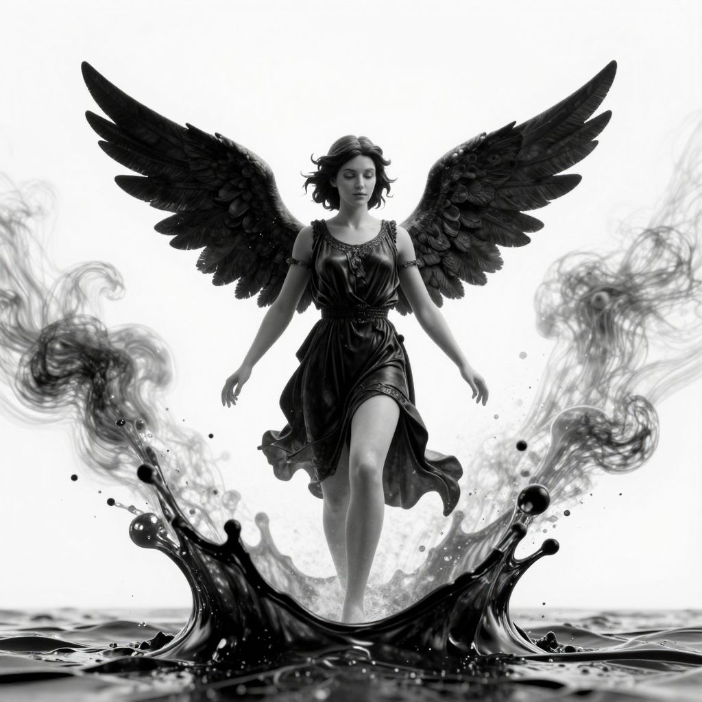 Black-and-white digital art of a winged woman in a flowing dress, splashing water, with dramatic smoke effects around her.