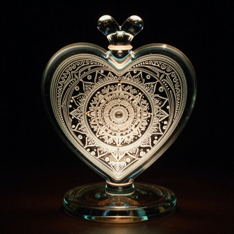 A hyper-realistic photograph of a glass heart mandala with intricate patterns, illuminated by dramatic lighting, captured with a Leica 50mm lens, Kodak Portra 800 film, and a f1.4 aperture.