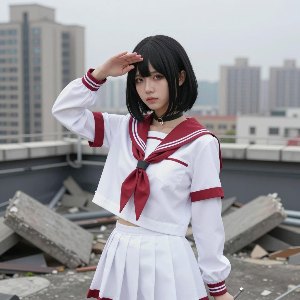 Asian woman with pale skin and black bob haircut, wearing a white sailor-style outfit with red accents and a black choker. She stands on a rubble-filled rooftop, hand shielding her eyes. Background includes tall, blurred city buildings. She holds a small object in her right hand. Intense gaze.