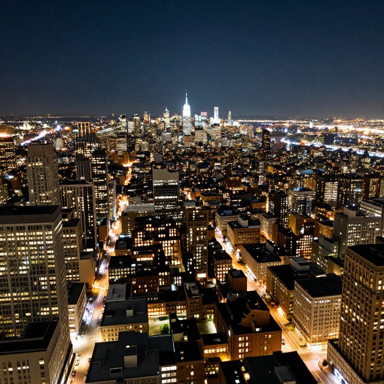 City lights aesthetic showcasing a panoramic view of a sprawling city from above, thousands of twinkling lights creating a complex web of urban life, blending modern architecture with classic brick buildings under a starry sky.