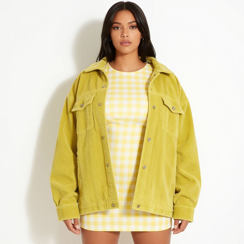 "Woman, contemporary casual, chartreuse corduroy jacket with a relaxed fit, buttoned front, and breast pockets, paired with a yellow and white gingham mini dress, round neckline, short sleeves, fitted silhouette, white background with minimal shadow, studio setting.. Sexy. Pretty face and beаutiful eyes. Big breasts."