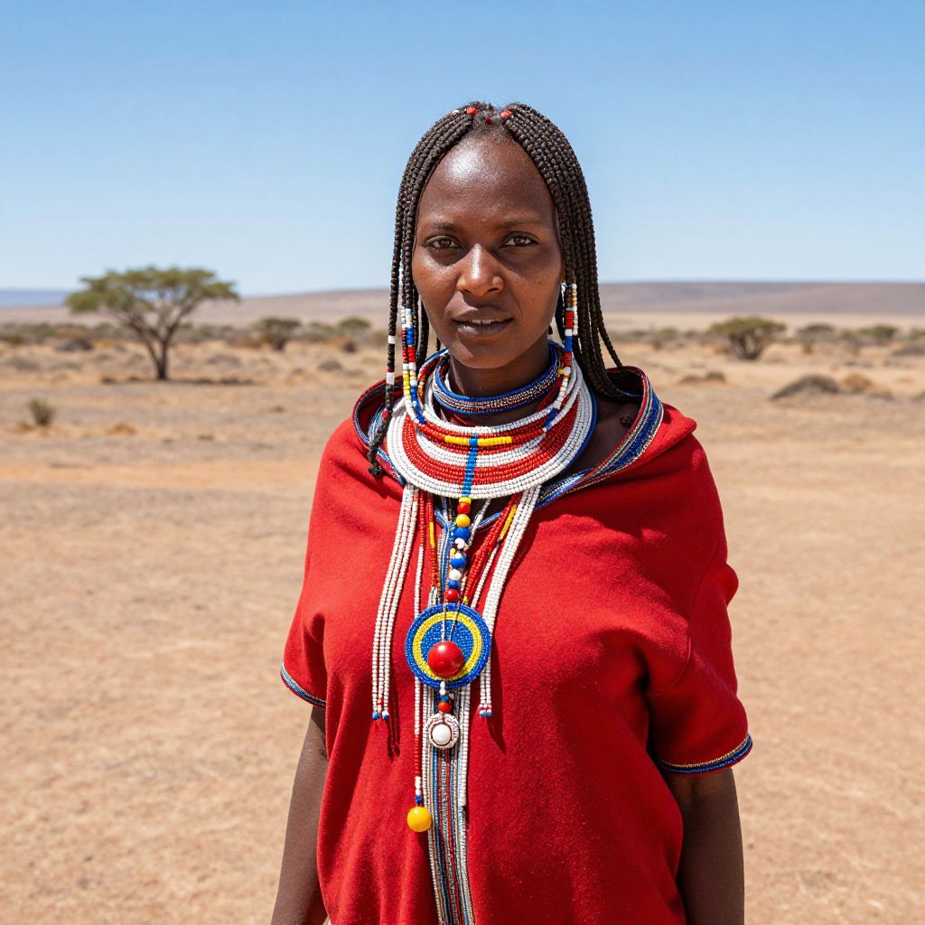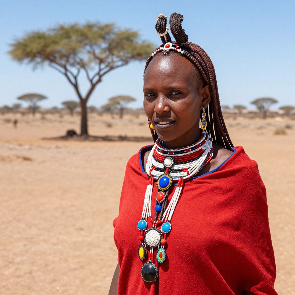 Photograph of an African woman standing in a sunlit, arid desert landscape with a clear blue sky. She has dark skin, braided hair, and is wearing a vibrant red traditional dress adorned with intricate white and blue beadwork and a large circular red and blue pendant. She also wears multiple layered necklaces with colorful beads. The background features dry, sandy terrain with sparse vegetation and a distant tree. The image is brightly lit, highlighting the vivid colors of her attire and the natural landscape.