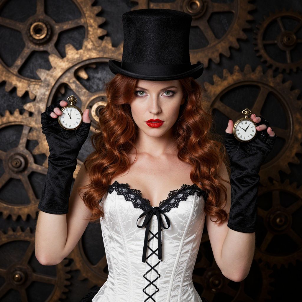Steampunk woman with red curls, black top hat, white corset, black gloves, holding pocket watches, against a gear-filled background.
