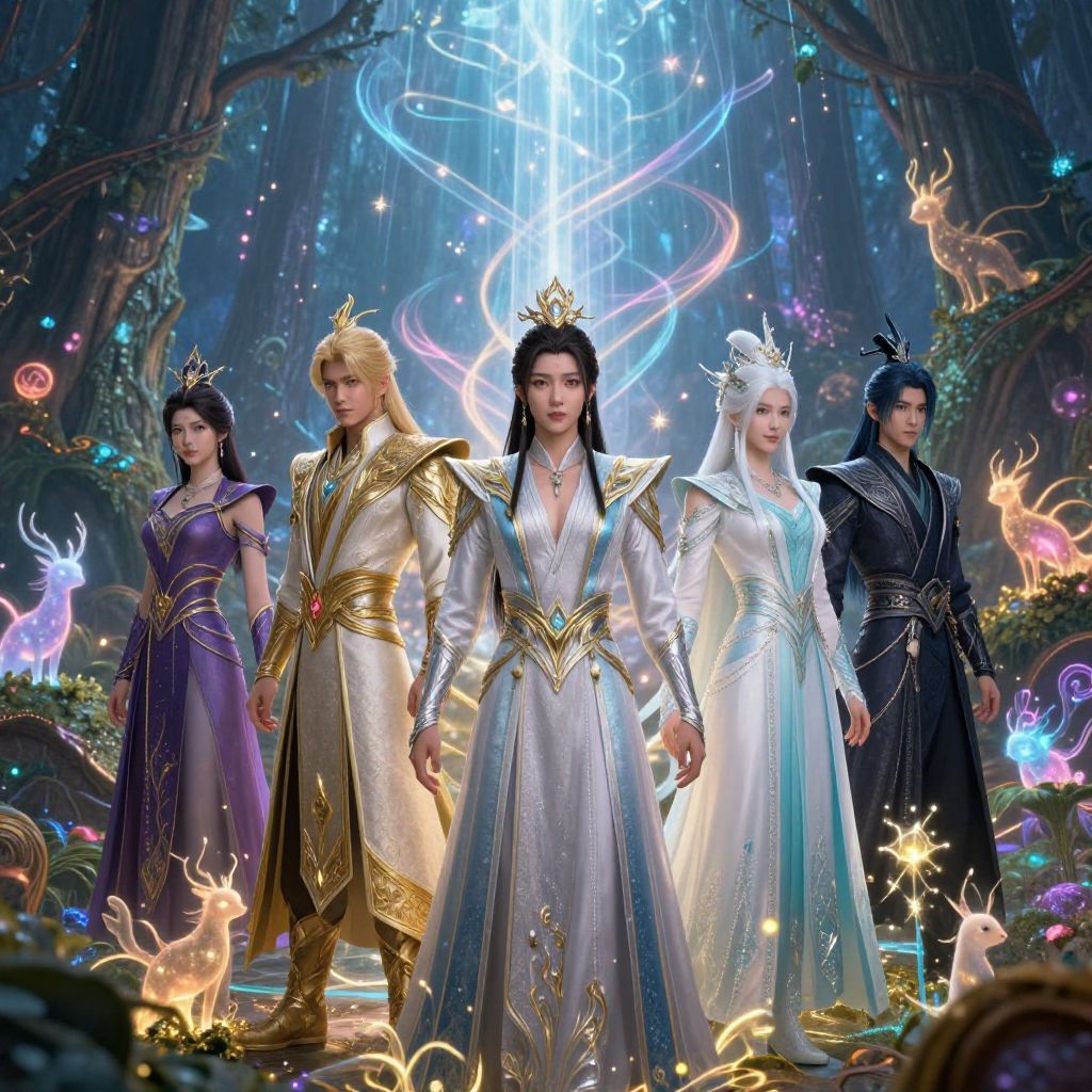 Digital artwork of three fighters in traditional Chinese attire: red and blue qipao with gold patterns, black leather jacket, and fingerless gloves, standing