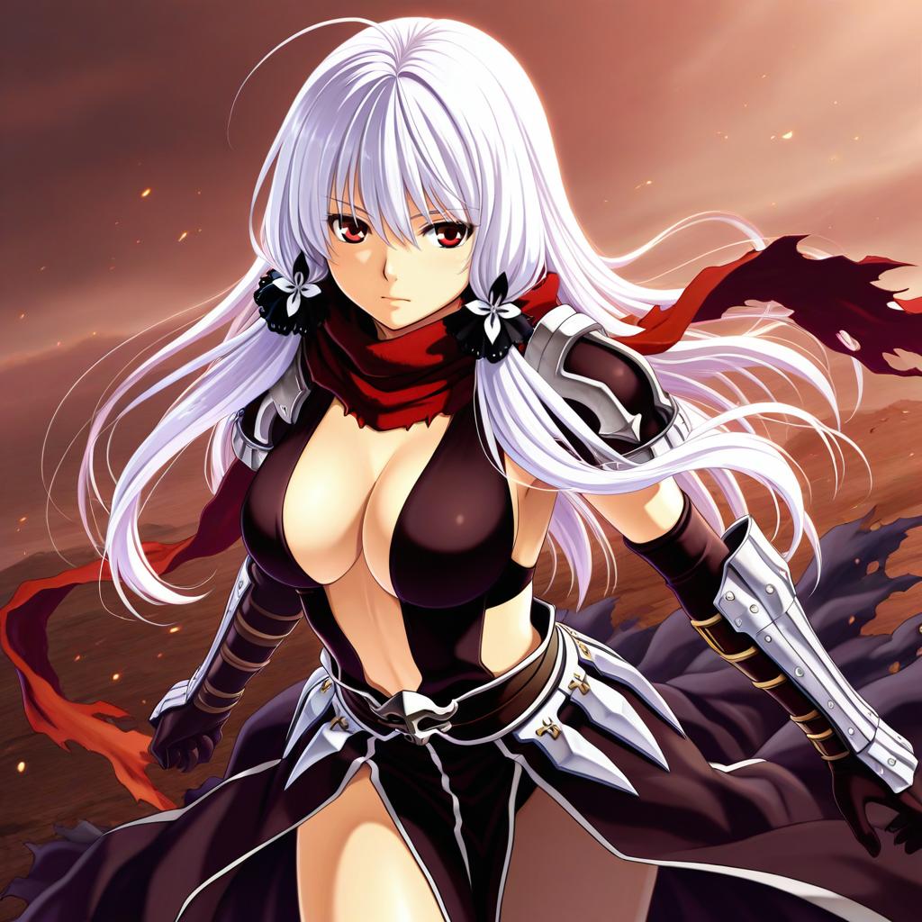 Assassin cross (ragnarok online), ragnarok online, 1girl, hair between eyes, red eyes, long hair, medium breasts, large breasts, red scarf, torn scarf, elbow gloves, waist cape, torn cape, black cape, vambraces, pauldrons, by artist ikeda kazumi, illustrious