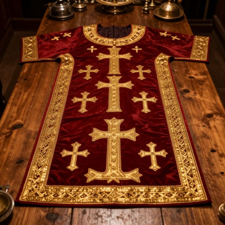 An ancient analavos vestment laid out flat on aged wooden table, detailed gold stitching, Eastern Orthodox Christian crosses and designs, ambient warm light highlighting texture and craftsmanship, antique religious artifacts surrounding it, deep rich colors