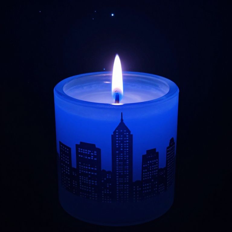 Single candle glows with a vibrant blue flame, casting the silhouette of a bustling cityscape onto its wax surface, while a starry night sky forms the backdrop.