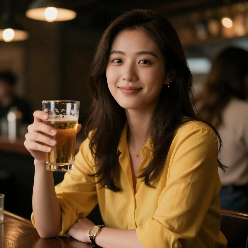 Photograph of a young woman with long dark hair, wearing a yellow blouse, sitting at a dimly lit bar. She holds a glass of beer in her right hand and smiles slightly. A blurred figure with long hair is in the background. Warm, ambient lighting highlights her face.