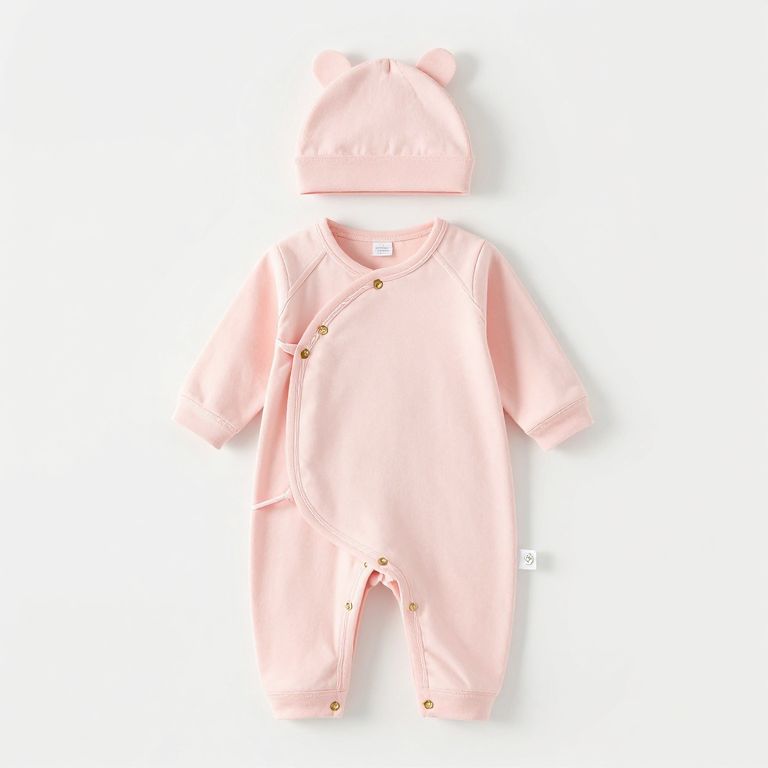 Soft pink newborn baby clothing set featuring a matching cap and long-sleeve romper with gold buttons down the front, displayed against a clean white background.