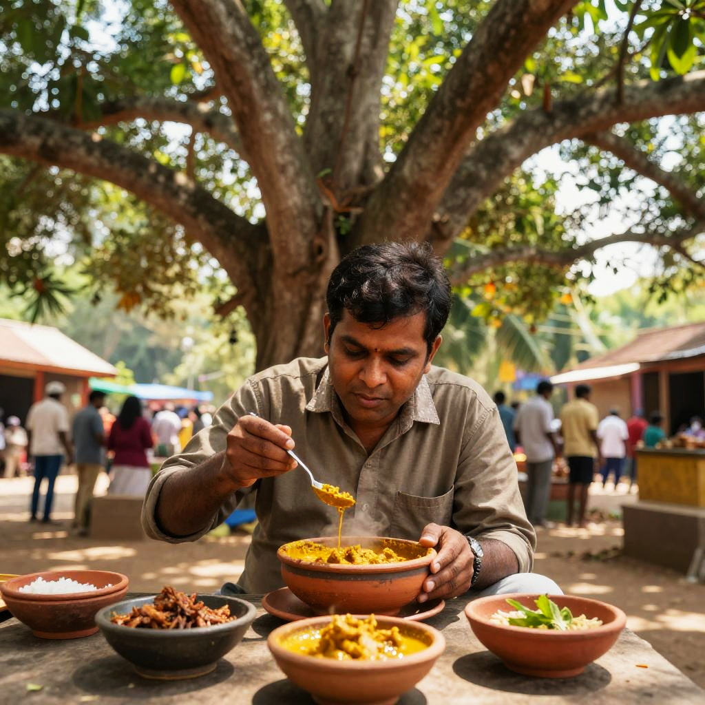 Fat Indian man eating curry in a bustling street market, vibrant colors, detailed spices and steam rising from the bowl, warm lighting, joyful expression, cultural richness