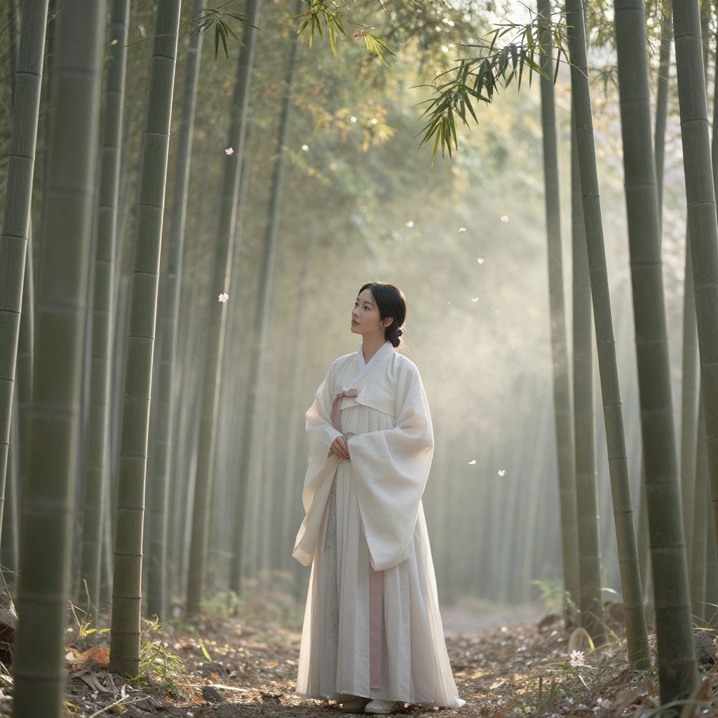 Black hair Asian woman standing in a serene bamboo forest at dawn, soft sunlight filtering through the leaves, wearing a traditional flowing hanbok dress, delicate cherry blossoms floating in the gentle breeze, peaceful and ethereal atmosphere, ultra-detailed.