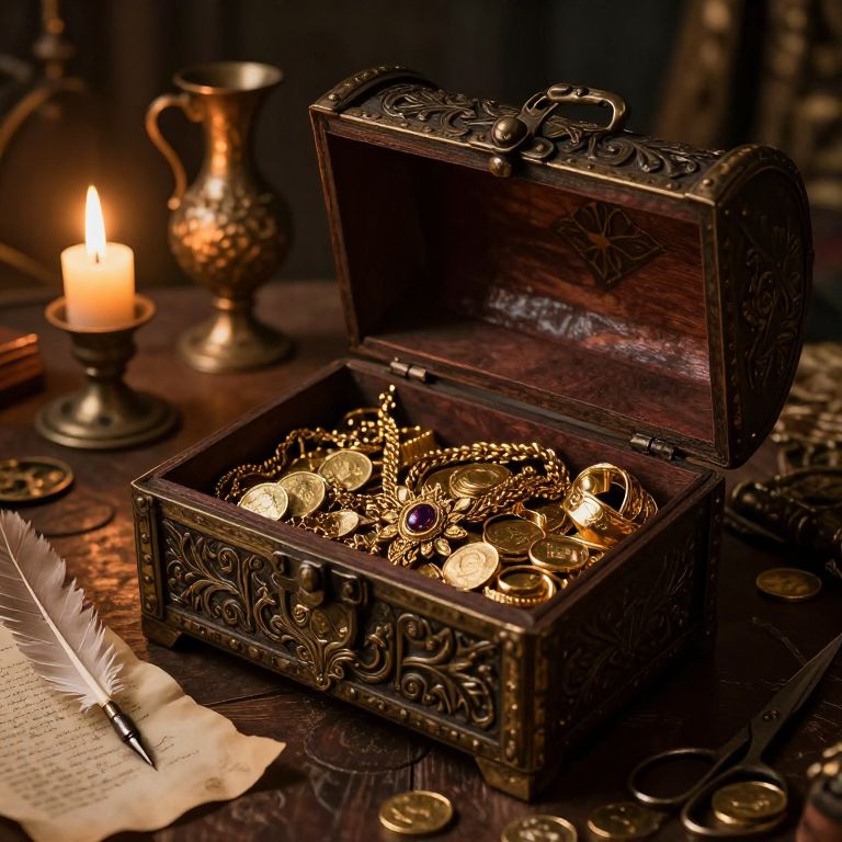 The image presents a captivating scene of a medieval table, bathed in the warm glow of candlelight, with an open, ornate metal treasure chest at its center. The chest is brimming with an array of gold and gem-studded treasures, including intricate necklaces, rings, and coins, all reflecting the soft, ambient light. To the left of the chest, a quill and a piece of parchment lie on the table, suggesting a narrative or a record of the treasure's origins. Surrounding the chest are various other items, such as a small, ornate vase and a pair of scissors, adding to the sense of a well-loved and used space. The overall composition is rich in detail, with a focus on the textures of the metal, the gleam of the gold, and the intricate patterns on the chest and other objects. The interplay of light and shadow enhances the depth and realism of the scene, creating a sense of mystery and allure.