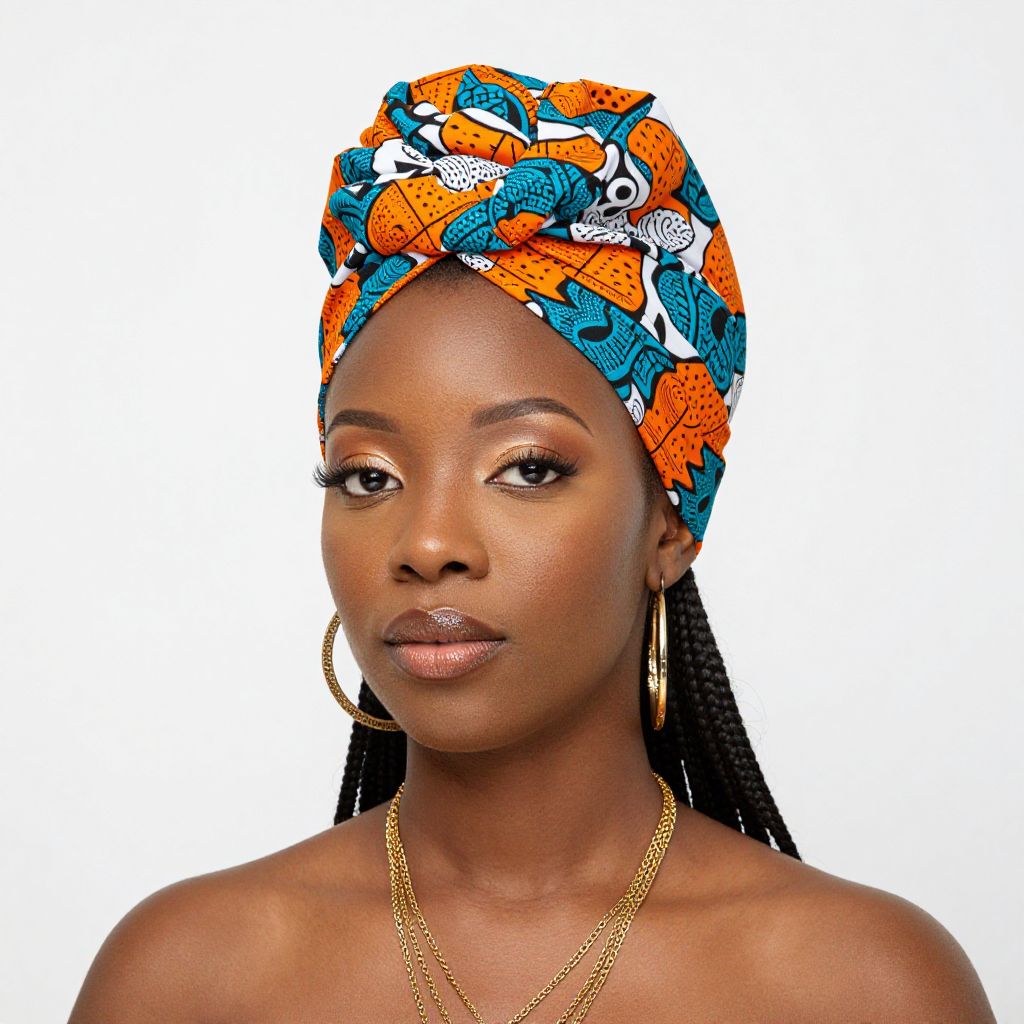 Woman modeling vibrant orange and teal African-inspired headwraps styled in a double-layered knot atop her braided hair, complemented by gold hoop earrings and layered necklaces against a plain white background.