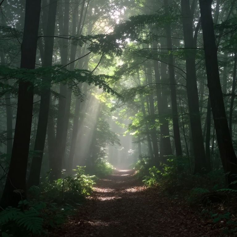 A mist-shrouded forest whispers secrets through its towering trees, where sunlight filters through like ethereal beams, casting an otherworldly glow over a path that seems to lead into the heart of a dream.
