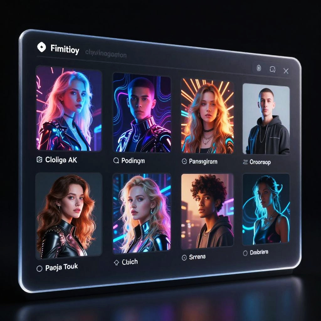 Ai free image generator, sleek user interface on a transparent screen with AI algorithms creating diverse art pieces, cyberpunk style, neon light reflections, dynamic and fluid visuals, cutting-edge technology visualization