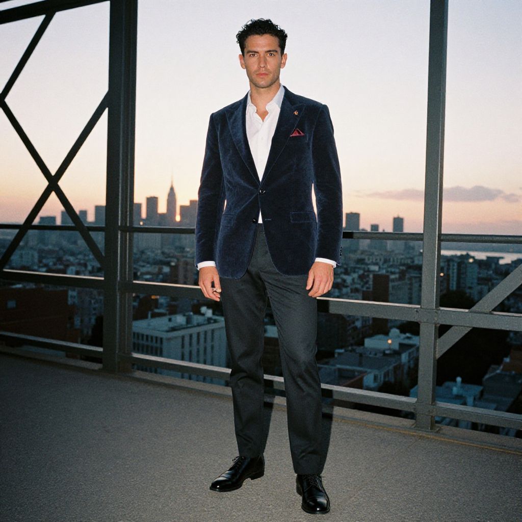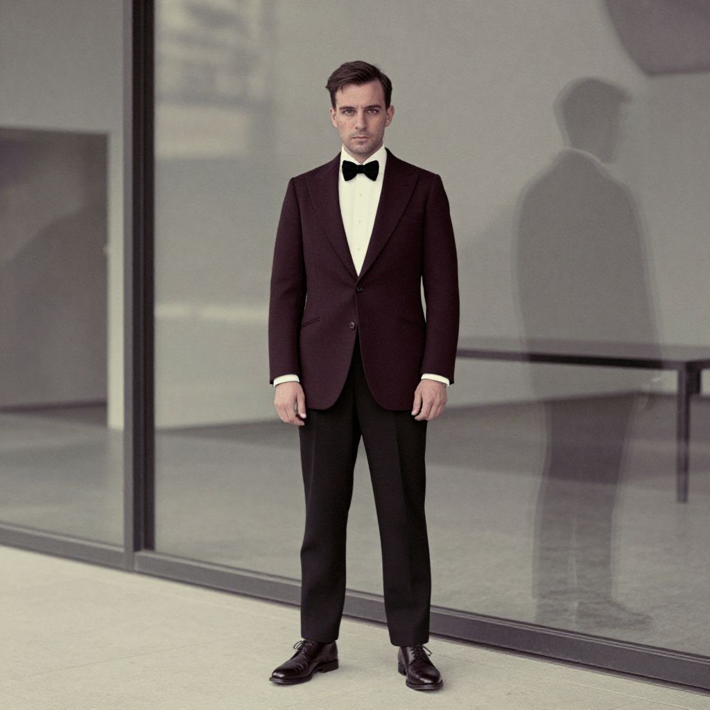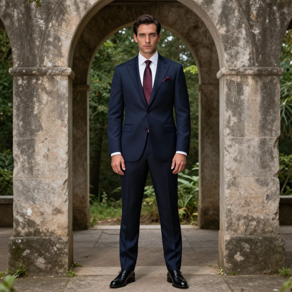 A man, burgundy velvet dinner jacket, white dress shirt, black satin bow tie, black formal trousers, black patent leather monk strap shoes, black silk pocket square, black dress watch, tropical rainforest exhibit, vibrant foliage, cascading waterfall, 3M analog film stock, confident expression Man has masculine face and piercing eyes