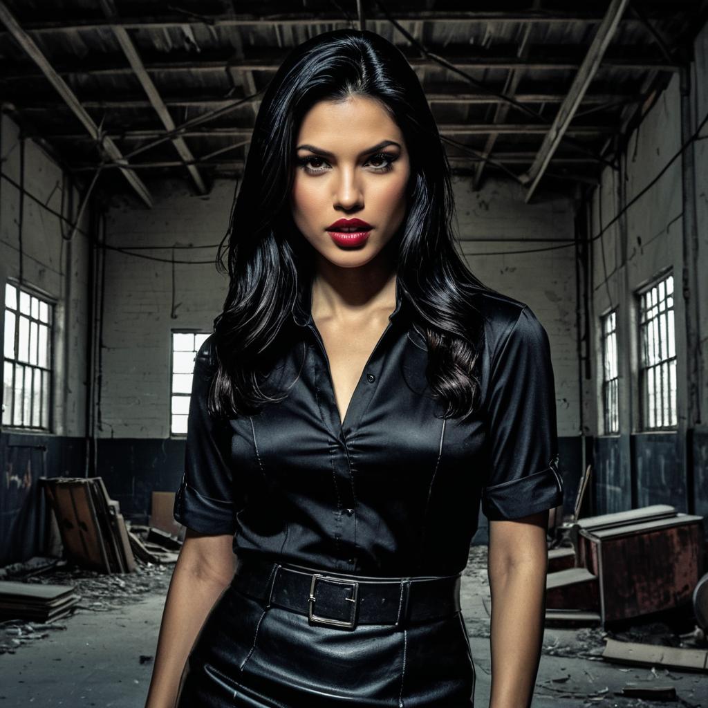 Tall female vampire, Middle-Eastern, brown almond-shaped eyes, long sleek black hair, modest black leather skirt, black silk shirt, small fangs, no makeup, mischievous smirk, athletic build, abandoned warehouse, dark booth, detailed, dark colors, graphic novel illustration, 2d shaded retro comic book