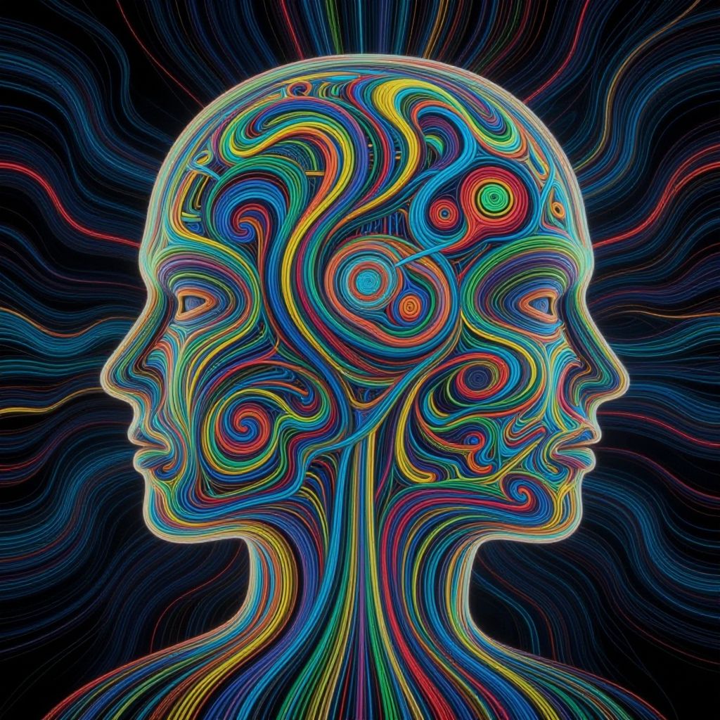 The image presents a highly intricate and detailed psychedelic art piece, featuring a human head in a state of open consciousness. The head is adorned with swirling, colorful lines that resemble neural pathways or energy currents, creating a sense of movement and depth. The colors are vibrant and varied, including shades of blue, green, yellow, and red, which converge and diverge in a mesmerizing pattern. The lines are not only confined to the head but also extend outward, almost as if the mind is expanding into the universe. The lighting is professional, highlighting the intricate details and adding a three-dimensional quality to the artwork. The overall composition is symmetrical, with the lines and colors balanced on either side of the head, creating a harmonious and visually striking effect. The use of line art and wave patterns enhances the sense of motion and energy, making the image appear almost alive. The background is dark, which contrasts sharply with the bright, colorful lines, making them stand out even more. The image is a testament to the power of visual art in conveying complex, abstract concepts in a visually engaging manner.