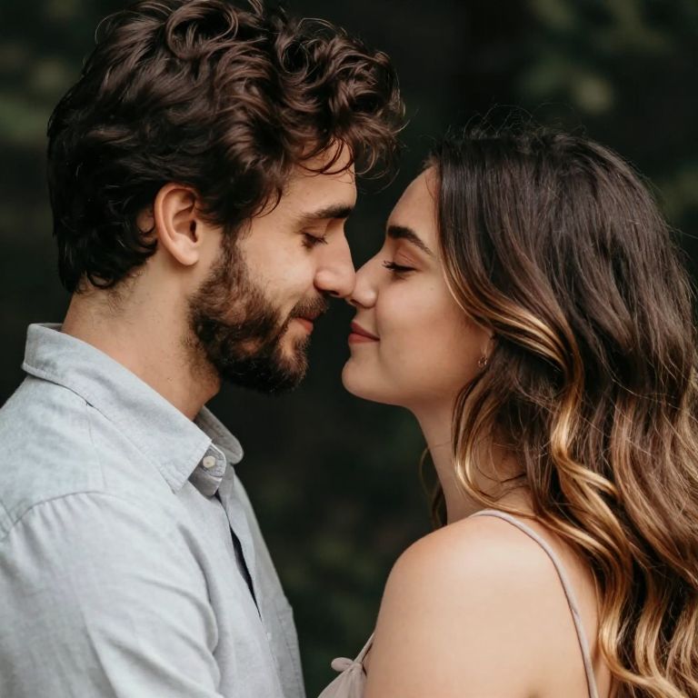 Photograph of a cute, intimate couple. The guy has dark, wavy hair, a beard, and is wearing a light gray shirt. The girl has long, wavy brown hair with blonde highlights, and is wearing a thin-strapped top. They're closely facing each other, their noses touching, with soft, romantic expressions. The background is dark and blurred, keeping the focus on their faces.