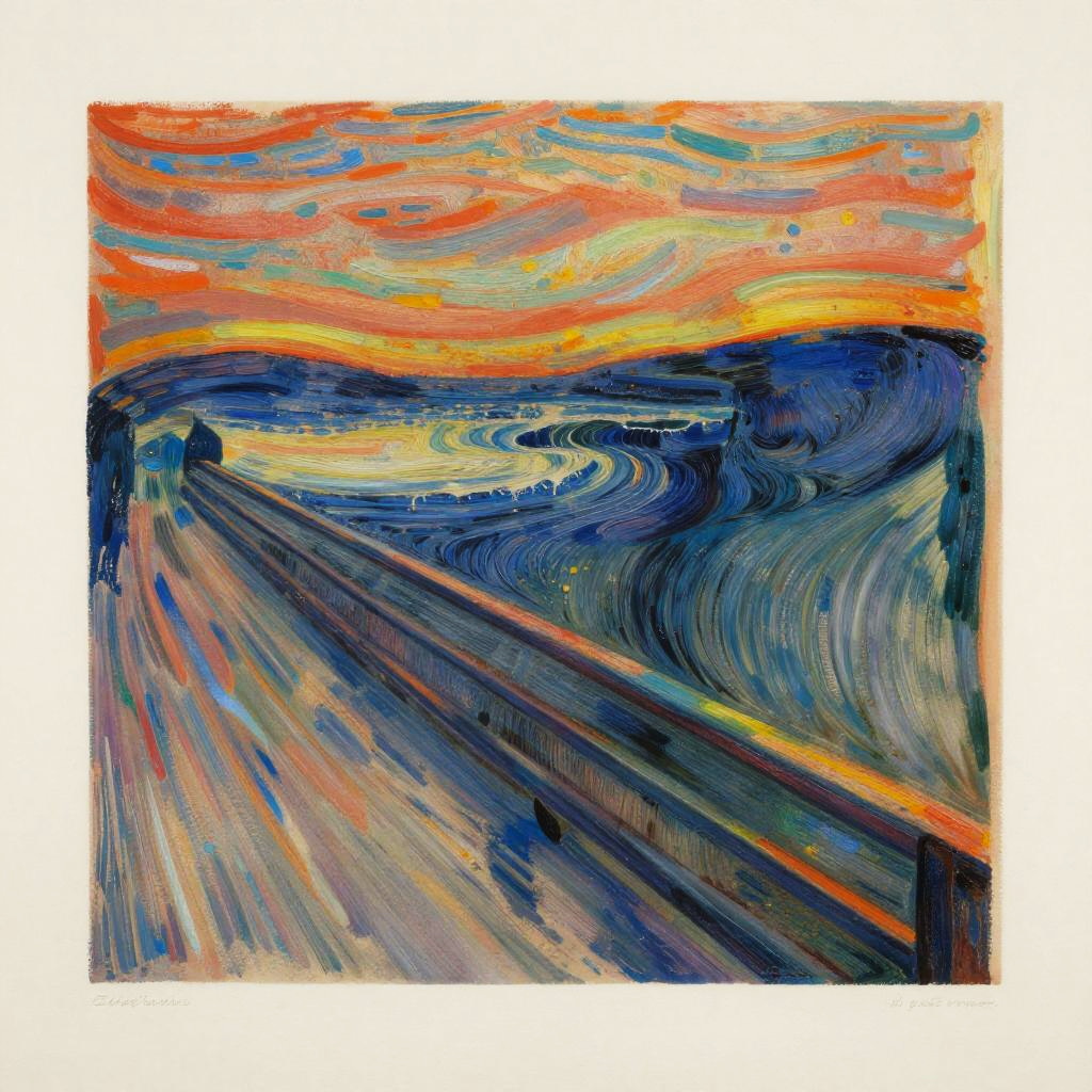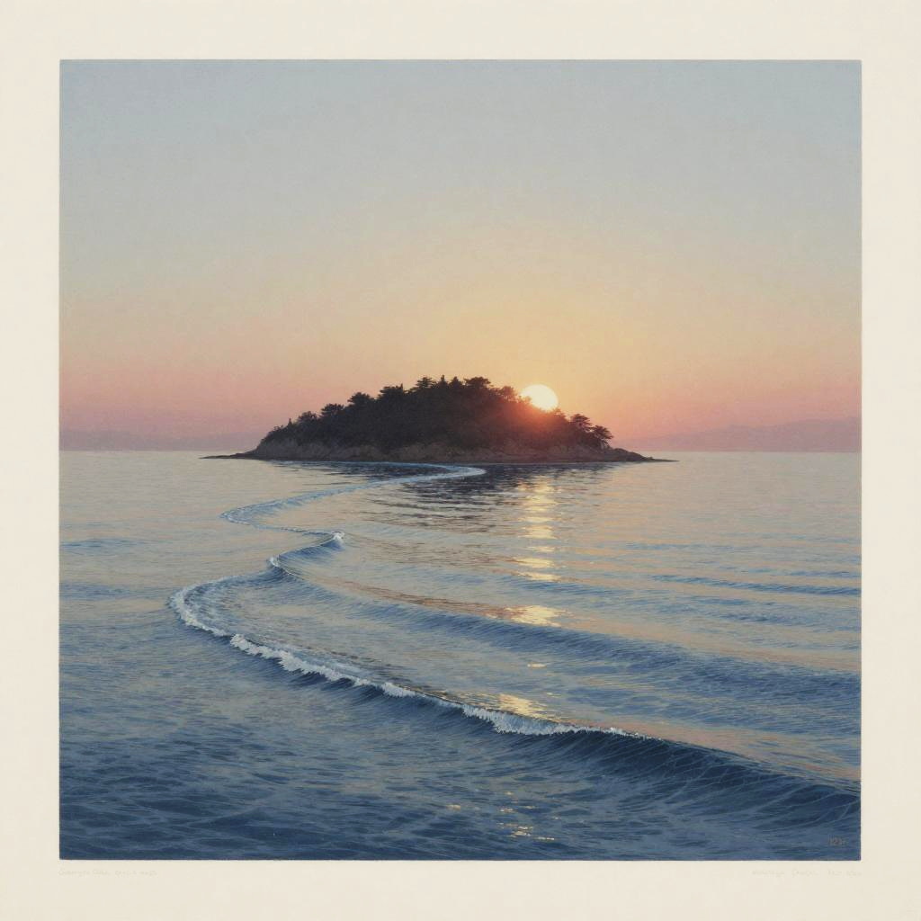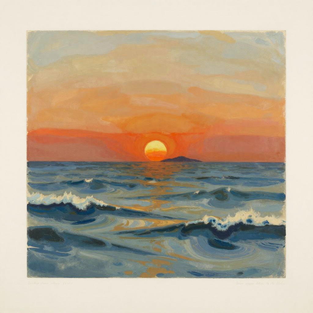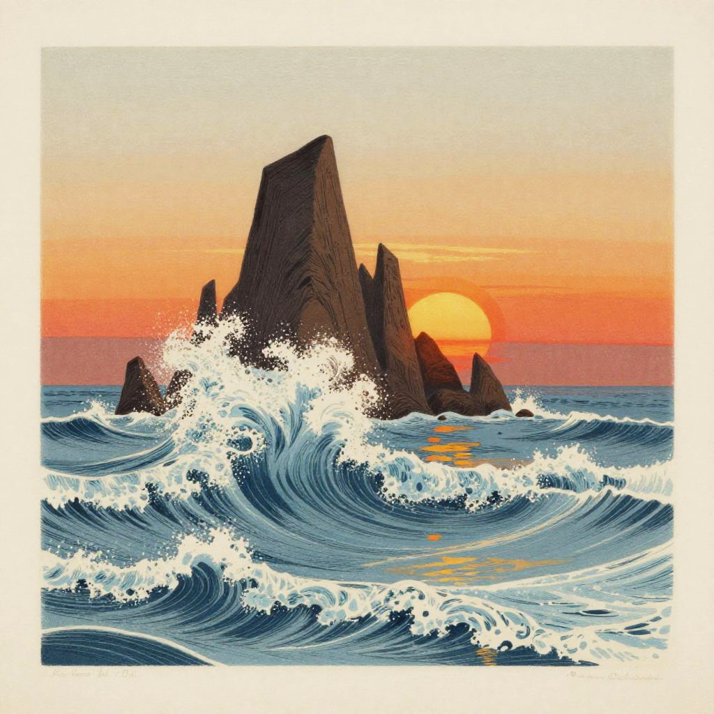 Chromolithography print with encaustic oil and ink, featuring rough icy waves crashing against cliffs of a small island with fiery sunset sky, minimalistic style by Edgar Degas, Camille Pissarro. Soft diffused light, subtle grain, moody atmosphere, stunning and detailed.