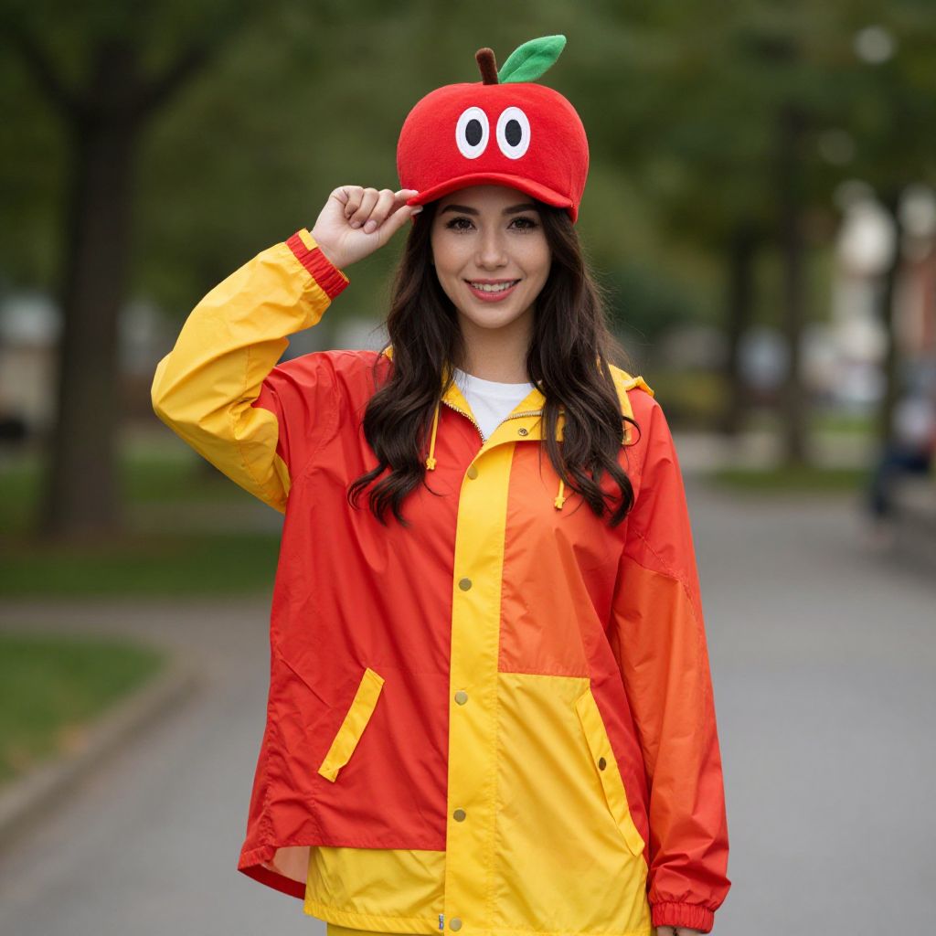 "Woman Apple Jolly Rancher Costume, woman wearing a red and yellow rain jacket and a red apple hat"