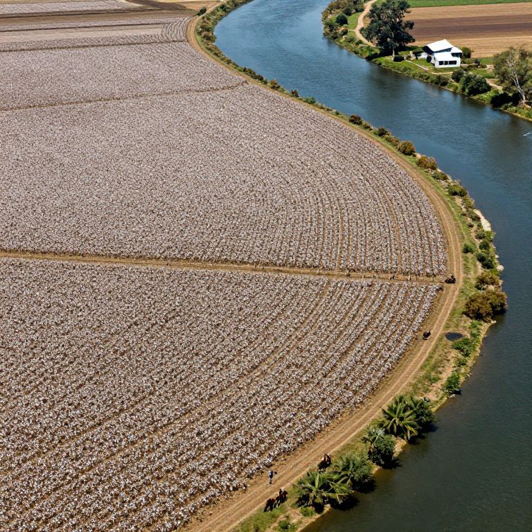 Contour aerial view from 30,000 feet of a cotton plantation in a bend in a river, house not right on river, workers in field, people riding horses,